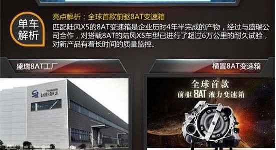 与陆风X5匹配的8AT变速箱是一家公司的产品,该公司花了四年半的时间才完成。通过与盛瑞公司的合作,搭载8AT的陆风X5车型的耐久性测试已经进行了6万多公里,并对新产品的质量进行了长期监测。这款陆风X5(8AT)上市后,将成为全球首款配备前置8AT液压变速器的SUV车型。未来,陆风旗下多款SUV车型也将陆续匹配8AT变速箱。