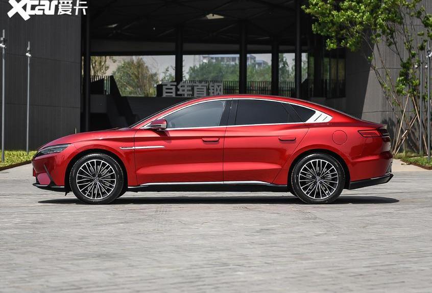 汉EV的车身尺寸为4960*1910*1495mm,轴距为2920mm。不难看出,该车采用了溜背式设计,多层次线条覆盖车侧,避免了单调感。同时,比亚迪将前舱盖与翼子板之间的缝隙与腰线融为一体,整体性能显著提升。