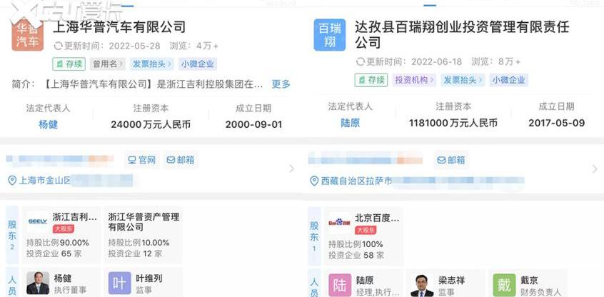 我们了解到,积都汽车股份有限公司有限公司发生了工商变更,浙江吉利控股集团旗下附属公司上海华普汽车有限公司有限公司已退出,百度旗下附属企业白瑞祥创业投资管理有限公司的持股比例已增至100%。