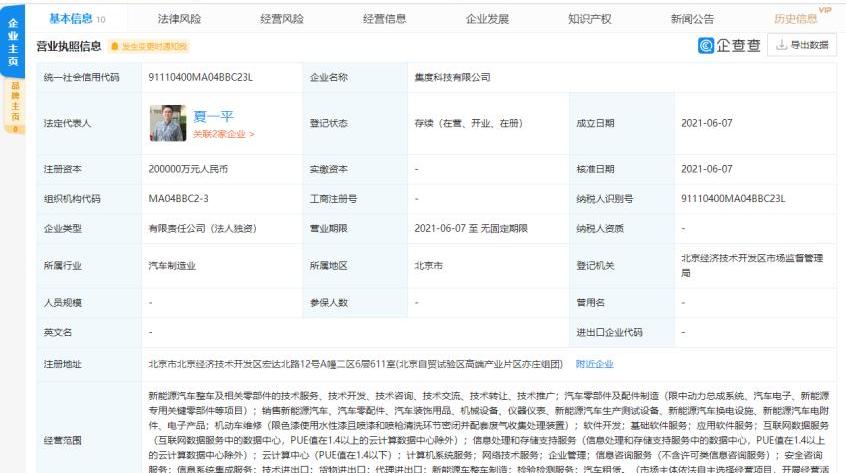 作为汽车行业的新玩家,今年1月11日,百度正式宣布成立一家智能汽车公司,以整车制造商的身份进军汽车行业。吉利控股集团已成为这家新公司的战略合作伙伴。今年3月,吉利和百度成立了一家新的合资公司。合资公司名称为“积都汽车股份有限公司”,品牌定义为“百度人工智能能力集成”。新公司注册资本20亿元,夏一平兼任法定代表人、董事长和总经理。在今年6月的沟通会上,集度表示,该品牌的新车价格将不低于20万元,并能给年轻人带来高级感;10月将举行品牌发布会,新车将在明年4月的北京车展上正式发布。