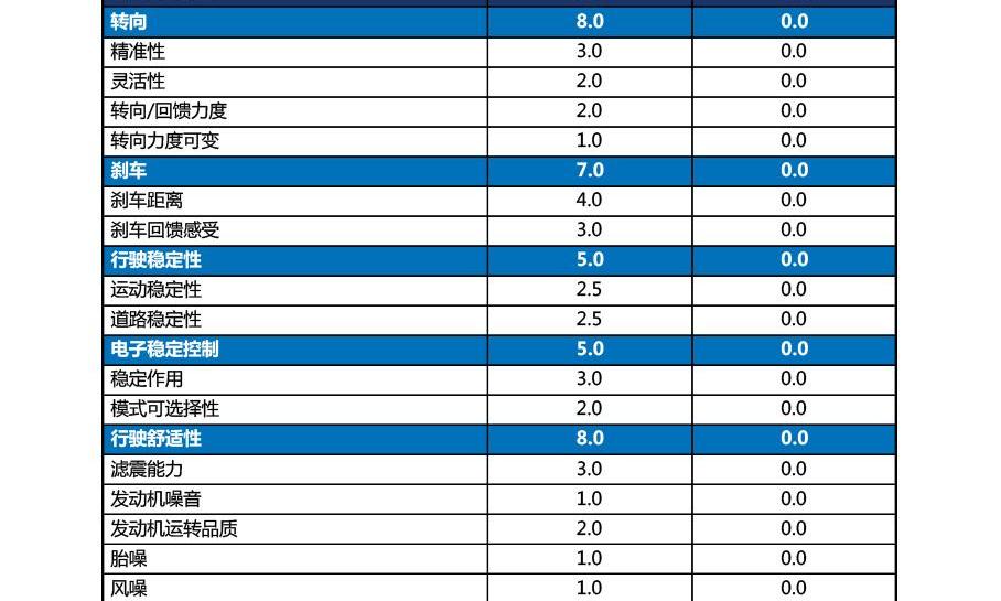 除了发动机,变速器的性能也很重要,所以变速器和发动机各占10分。我们为变速器项目开发了两个不同的评估项目,以适应自动变速器和手动变速器。3、 驾驶和乘坐总分为33分,包括转向、制动、驾驶稳定性、电子稳定控制和驾驶舒适性五项。