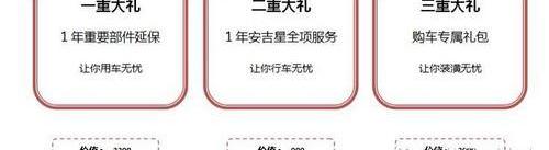 活动期间,订车加99元的客户,可获得一年重要零部件延保+1年安吉星全方位服务+3000元装修礼包!