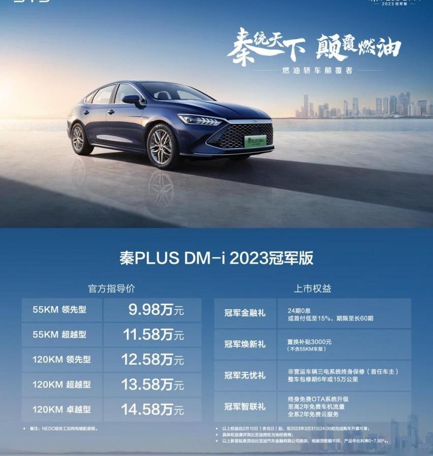 2月10日,秦PLUS(参数|询价)DM-i 2023冠军版正式上市,官方指导价为9.98万元-14.58万元。DM-i车型的价格首次降至10万元以下。作为“燃油车颠覆者”,秦PLUS DM-i 2023冠军版,五大细分、四大翻新,正式开启“油电同价”的新时代,加速新能源绿色出行方式转型,将燃油颠覆进行到底!