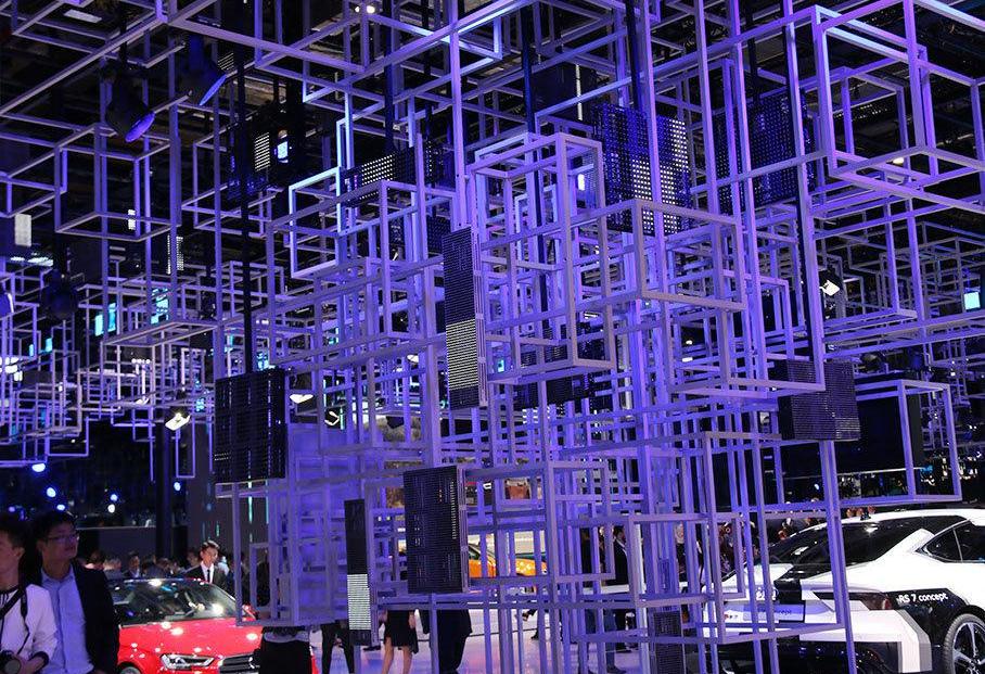 从远处看,展台上方的白色框架,加上不时变色的灯光,巧妙地将这一区域完全包裹在奥迪的科技魅力之下,让人忍不住走进来探索。这种布局风格完全出乎我的意料。