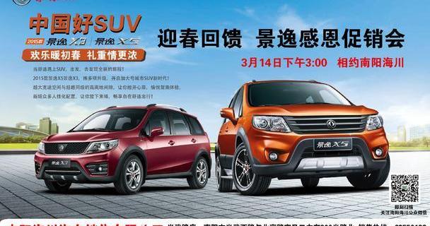 为了感谢广大新老客户多年来对丰兴景逸的支持和厚爱,南阳海川将于3月14日下午3点举办“春节礼遇景逸感恩促销”活动。全车系都将参与团购优惠,还有6款好礼等你来拿!