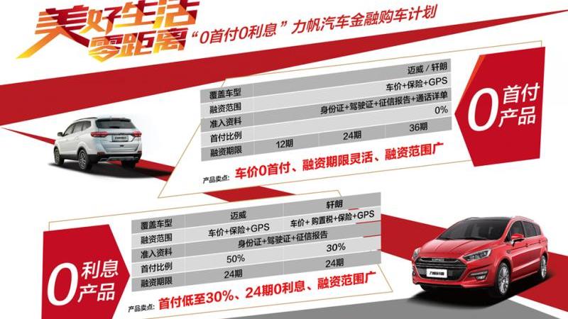 别担心!力帆汽车推出了一项特别的金融购车计划,让你与美好生活零距离。即日起至8月31日,消费者购买力帆轩朗、迈威车型可享受0首付或0利息优惠,成为零压力车主。