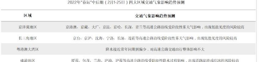 “报告预测,2022年春节期间,华南地区的气温将低于正常年份同期,湖北南部、重庆、四川东部、贵州、广西北部、湖南大部分地区、江西西部和西藏西部的气温将降低1至2℃。”,长江流域的降水量相对较高,而2月份,西北东部和中国北部的降水量较高。西南东部、华南西部、中南部、东部和西南部可能出现周期性、大范围低温雨雪冰冻天气过程。总体而言,2022年“春运”期间,全国大部分地区的天气气候条件对道路交通影响不大,但部分地区可能会出现周期性、局部性的冰冻雨雪、低能见度、冻雨等灾害性天气,可能对交通产生不利影响。以春节为分水岭。“春运”前期,要重点关注江苏、安徽、山东、河南、湖北等地的大雾天气,以及河北、山西、河南、西藏、陕西、甘肃、宁夏、湖南、广西、重庆、贵州等地的雨雪天气过程对交通出行的不利影响。在“春节”中后期,有必要重点关注山西、西藏、陕西、宁夏等地周期性降雪过程以及北京、天津、河北、长三角等地大雾天气对交通出行的不利影响。以北京、天津、河北、长三角、广东、香港、澳门、成渝四大地区为例,在“春节运动”中后期,京津冀地区以及北京、香港、澳门、北京、上海、深圳等长三角地区的一些高速公路,受到周期性大雾天气的影响,导致能见度低的高风险;成渝地区的一些高速公路,如厦蓉高速公路和包茂高速公路,受到周期性降水过程的影响,导致道路湿滑或结冰的风险很高。