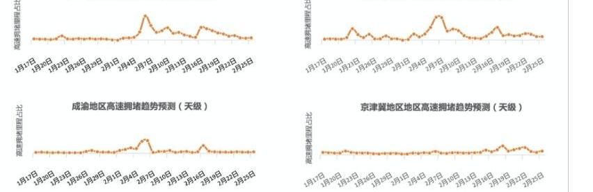 预计春节期间,广东、香港、澳门、长三角大湾地区高速公路交通压力较大,京津冀地区高速公路整体路况较好。出发阶段,预计1月22日长江三角洲地区和粤港澳大湾高速公路将出现短期出行高峰;成渝地区和京津冀地区高速出行相对分散,没有明显的高峰;春节交通返程阶段:预计长三角地区将于2月6日出现高速返程拥堵高峰,而粤港澳大湾地区、成渝地区将于二月5日和二月6日出现高度高速拥堵,京津冀地区将有一个相对稳定的高速整体。