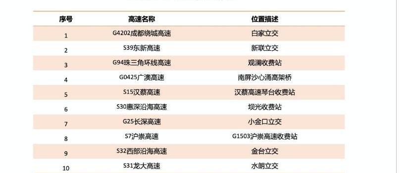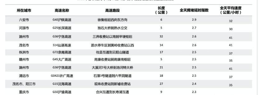 春节期间,预计全国易拥堵、交通缓慢的高速公路主要路段为:G40沪陕高速公路六安段,拥堵延误指数约2.9,全天平均速度约32公里/小时,其次为G25长深高速公路河源段,以及G36宁洛高速公路滁州段。建议行驶到以下路段的车主,时刻注意路况,及时避免拥堵。