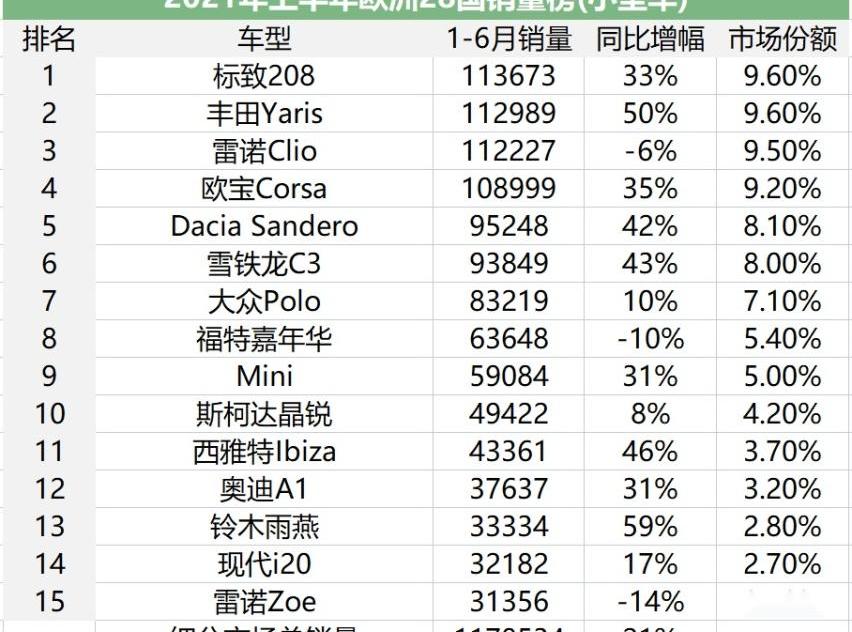 令人有些惊讶的是,在中国仍有一定存在感的Smart在欧洲的份额很小。我想知道如果这些车型在国内推出,是否有机会获得一定的市场份额。● 小型车:欧洲竞争最激烈的市场,或者说在以欧洲品牌为主的中国汽车市场,无疑是紧凑型汽车市场的最大细分市场,而在欧洲市场,销量最高、竞争最为激烈的市场是小型车市场。今年上半年……