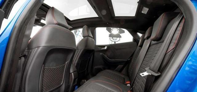 内饰也有着深厚的家族风格,大量的软质材料搭配皮革,座椅采用钻石图案设计。新车配备了与新款福克斯相同的三幅式平底运动方向盘(参数|查询)、悬浮式8英寸中控屏和12.3英寸全液晶仪表盘。在配置方面,福特彪马提供了自适应巡航、自动紧急制动、行人检测和车道保持辅助等主动安全系统,支持CarPlay和Android Auto,并提供了可提供180度后方视野的Copilot 360系统。还有10套音响系统。作为一款小型SUV,福特彪马的后排座位空间一般。
