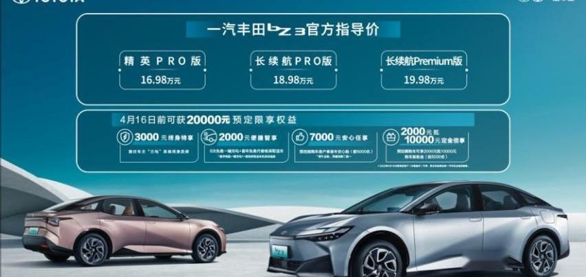 3月6日,丰田公布了全球首款纯电动汽车bZ3的官方指导价。新车分为三个版本发布,指导价分别为精英PRO版16.98万元、远程PRO版18.98万元和远程尊享版19.88万元;到4月16日,订购汽车的客户可以获得20000元的有限预订优惠。