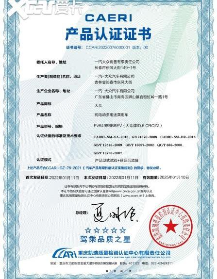近年来,新能源汽车的市场份额不断扩大。在电动汽车行业,各大汽车公司已将产品研发重点转向智能化和个性化,以期在用户选择方面取得突破。对于用户来说,如何在拥有“品牌个性”的同时确保驾驶和乘坐质量,成为用户在购买新能源汽车时最关注的核心问题之一。坚守初心,获得行业首个五星级驾驶品质之星认证一汽-大众ID CROZZ智能纯电动家族秉承坚守初心、“以用户为中心”的发展理念。它不仅从设计方面塑造了品牌个性,还在续航、充电、安全等“隐形”领域下足功夫,形成了既有“品质”又有“个性”的产品ICON。近日,一汽-大众ID.6 CROZZ(参数|查询)参加了由权威第三方检测机构中国汽车研究集团进行的行业首个“驾驶品质之星”认证测试。通过操控安全性、制动安全性、全功率、静音低噪音、热舒适性等五个维度的考核,获得五星级“驾驶品质之星”产品认证证书。