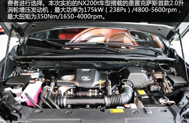 在动力方面,雷克萨斯NX提供三种发动机:2.0升自然吸气、2.0升涡轮增压和2.5升混合动力。2.0T发动机的最大功率为175kW/480-5600rpm,最大扭矩为350Nm/1650-4000rpm。2.0升发动机的最大功率为110千瓦/6100转/分,最大扭矩为189牛米/3800转/分。2.5升混合动力系统由2.5升四缸发动机和电动机组成,组合最大功率增至145千瓦。电动机负责驱动后轮,而发动机负责驱动前轮。与发动机匹配的是一款新开发的6速手自一体变速器。