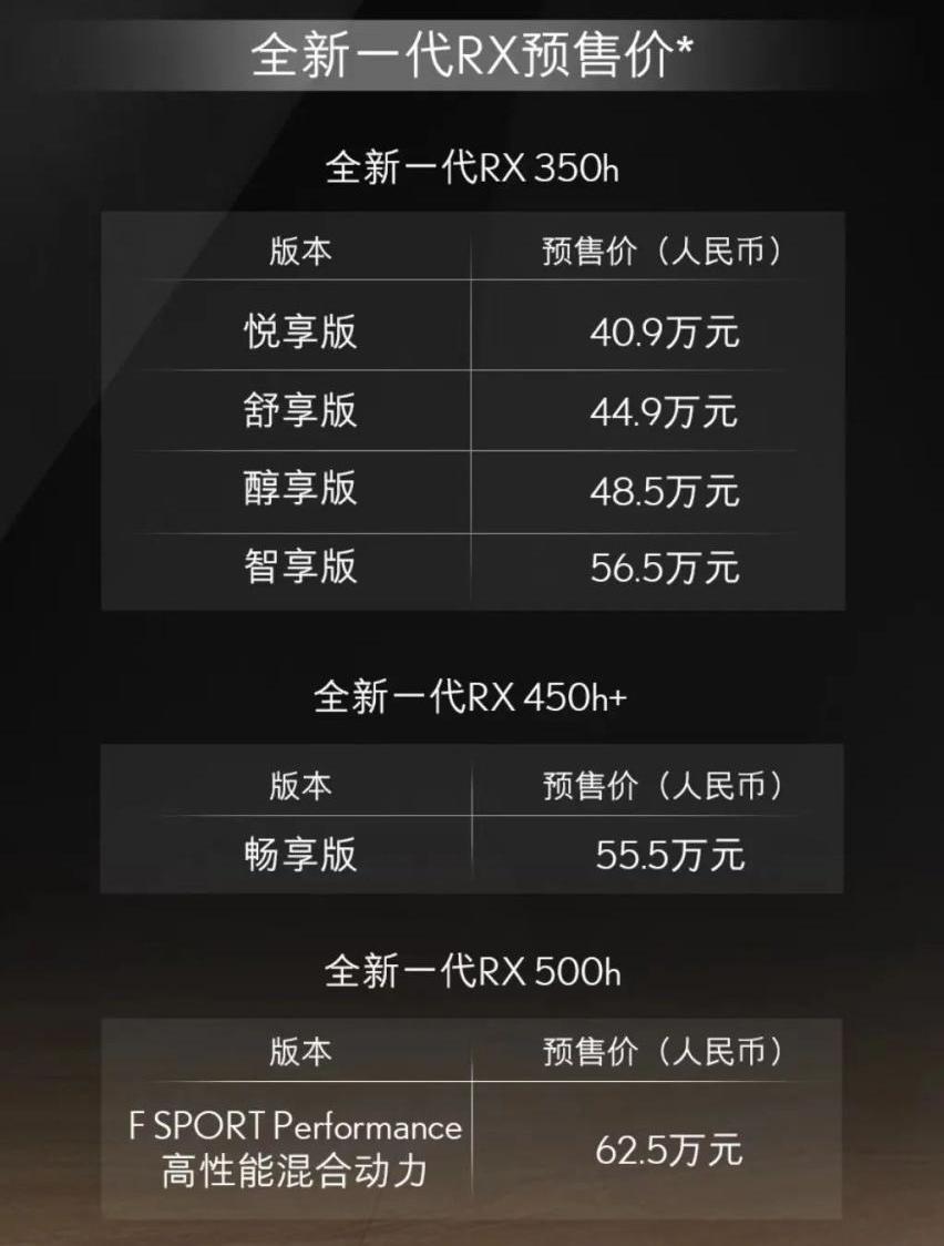 编辑点评:新款雷克萨斯RX在设计和配置上进行了重大升级,在质感和技术方面都有不错的表现。它还提供了三种动力,即2.5升油电混合动力/2.5升插电式混合动力系统和2.4升油电混动系统,以满足不同人群的需求。