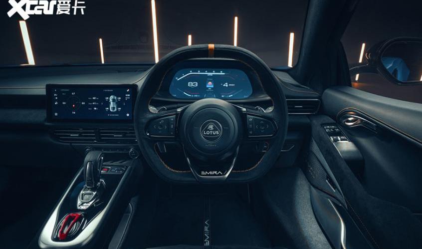 内饰方面,路特斯EMIRA采用了最新的方向盘设计,两侧采用平底设计。路特斯EMIRA配备了12.3英寸的仪表板和10.25英寸的触摸屏显示屏。此外,新款方向盘还增加了黄色缝线,给人一种动感。