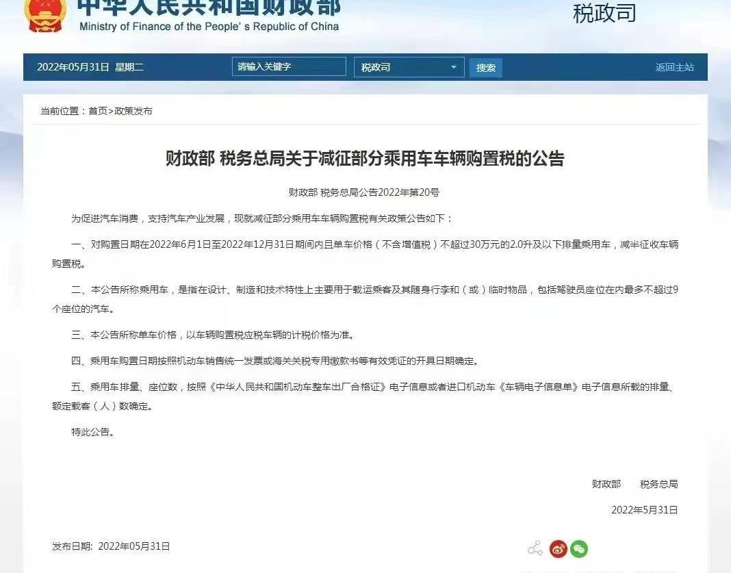 5月31日,财政部、税务总局联合发布公告,为促进汽车消费,支持汽车产业发展,现就减征部分乘用车车辆购置税有关政策公告如下: