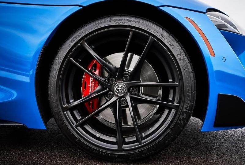 新车车头较为修长,车尾较为短促,车身比例显得富有运动感。新车车尾部分,后备厢盖下方是丰田牛头LOGO和Supra字样标识,尾灯组在第四代Supra的基础上进行了进化,尾灯外部轮廓变为向两侧扩散的三角形。新车的大型后扩散器采用黑色涂装,充满金属光泽的双边共两出式圆形排气管也拥有非常可观的口径,看上去帅气又霸道。