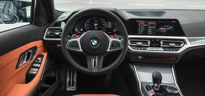 内饰方面,全新第6代宝马M3和M4借用了3系和4系的许多功能设计理念,包括相同的10.3英寸中央触摸屏和12.3英寸数字仪表盘,只是有一些细微的变化体现运动性增强,例如中控台上全新的红色停止按钮、可选装的碳纤维饰件、遍布室内的M标识以及方向盘上的红色M Mode按钮,后者可以实现Road模式的切换。最新的iDrive 7.0操作系统还提供导航、无线Apple CarPlay和Android Auto连接以及宝马个人语音助手等标准功能,还可以使用选装的抬头显示来显示。值得一提的是,数字仪表板采用M专属图形。