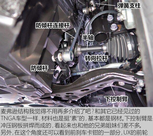 其实在紧凑型级别里,前悬架不用看也能猜到是麦弗逊结构,毕竟,这年头偏执的“疯子”越来越少,而通过零部件的大量通用化带来的利润才是实打实的。所以,既然是TNGA架构的橫置平台,UX的前悬架还肯定和凯美瑞以及CH-R脱不开干系。