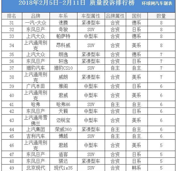 第31位到第50位的车型中,大部分都来自于合资品牌,自主品牌车型仅占5席。合资品牌中,德系、美系、日系各自平分秋色,相差数量也较为接近。但是来自于合资品牌的几个车型基本都是其品牌的主销车型,平均月销量都很高,但是他们的投诉量却并不是很高,这也说明了这些来自合资品牌的主销车型的可靠性。《环球网汽车 质量口碑排行榜》只是将上周的投诉数据进行归纳和统一,以便于对您的购车起到一定程度的辅助,榜单中所有数据均来自于车质网。