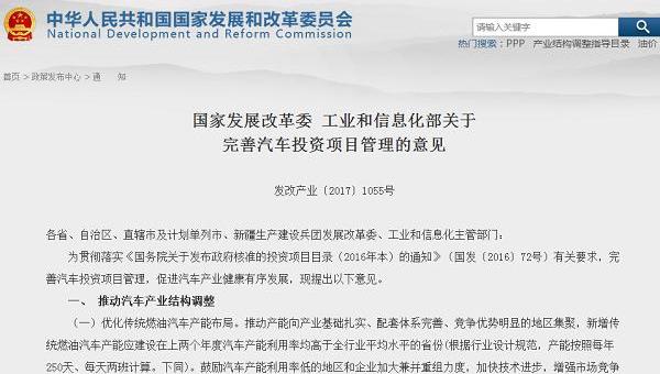 国家发展改革委 工业和信息化部关于完善汽车投资项目管理的意见发改产业﹝2017﹞1055号各省、自治区、直辖市及计划单列市、新疆生产建设兵团发展改革委、工业和信息化主管部门: