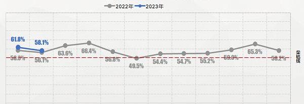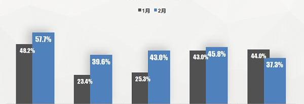 资料来源:中国汽车流通协会关注二月。最新数据显示,2月中国汽车经销商库存预警指数为58.1%,同比增长2.0%,环比下降3.7%。流通协会表示,2月绝对库存环比上升,但2月销量环比增长更多。总体来看,存销比略有下降,表明2月份汽车流通行业景气度较1月份有所回升。从具体指标来看,今年2月市场需求、日销售额和员工指标均呈现改善趋势,反映出市场处于复苏状态;流通协会认为,经营业绩指标下降的主要原因是激烈的市场竞争,这是由多家车企降价销售造成的。