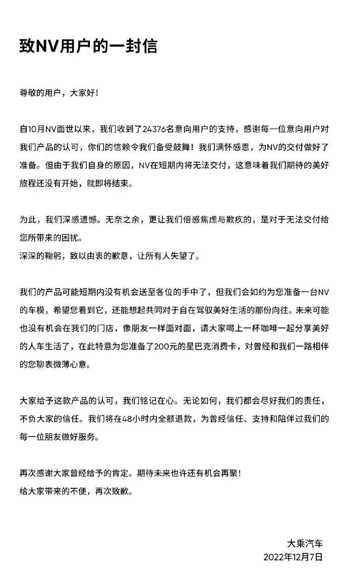 相关新闻:不要花钱,陪李一男去做一辆汽车的梦。新浪科技讯12月7日上午,官方微博账号发布消息称,李一男旗下的子优家汽车短期内无法交付车辆,将在48小时内获得全额退款。自优家表示,自NV于10月推出以来,已获得24376名意向用户的支持。短期内没有机会将产品交付给每个人,但我们将为目标用户准备NV模型。此外,子优家表示,未来其门店可能没有机会像朋友一样面对面。我们邀请大家喝杯咖啡,一起分享人与车的美好生活。我们专门为潜在用户准备了一张价值200元的星巴克消费卡。以下是原始内容:致NV用户的一封信。尊敬的用户,大家好!自NV于10月推出以来,我们已获得24376名潜在用户的支持。感谢每一位潜在用户对我们产品的认可。您的信任极大地激励了我们!我们充满感激之情,并为NV的交付做好了准备。但由于我们自身的原因,NV将无法在短期内交付,这意味着我们期待的奇妙旅程尚未开始,即将结束。我们对此深感遗憾。除了无助之外,更让我们感到焦虑和内疚的是,向无法交付所带来的麻烦深深鞠躬,并对让所有人失望表示诚挚的歉意。我们的产品可能没有机会在短期内交付给每个人,但我们会如期为您准备NV模型。我们希望,当你看到它时,你仍然可以记住我们共同的愿望,即自由地控制更好的生活。在未来,我们可能没有机会像商店里的朋友一样面对面。我们邀请大家喝杯咖啡,一起分享人与车的美好生活。我们特意为您准备了一张价值200元的星巴克消费卡,向一路陪伴在我们身边的您表示衷心的感谢。我们将牢记大家对这款产品的认可。不管怎样,我们会尽职尽责,不会辜负大家的信任。我们将在48小时内全额退款,为每一位信任、支持和陪伴我们的朋友服务。再次感谢您的肯定。期待未来,也许有机会再次团聚!对于由此给您带来的不便,我们深表歉意。Daisei Motors 2022年12月7日