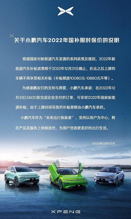 新浪科技讯11月30日上午,小鹏汽车在其官方博客上宣布推出限时限价政策。2022年12月31日前完成定金支付的订单将继续享受2022年国家新能源补贴,不考虑交付时间。注册时间造成的补贴差额由小鹏汽车承担。