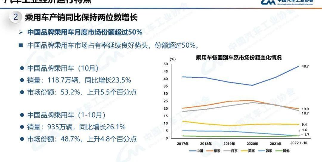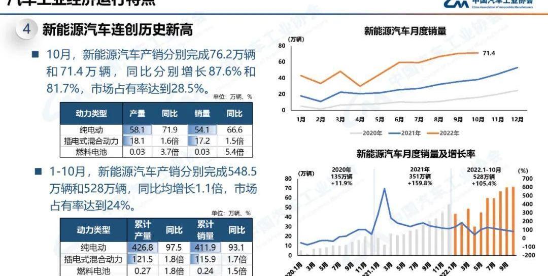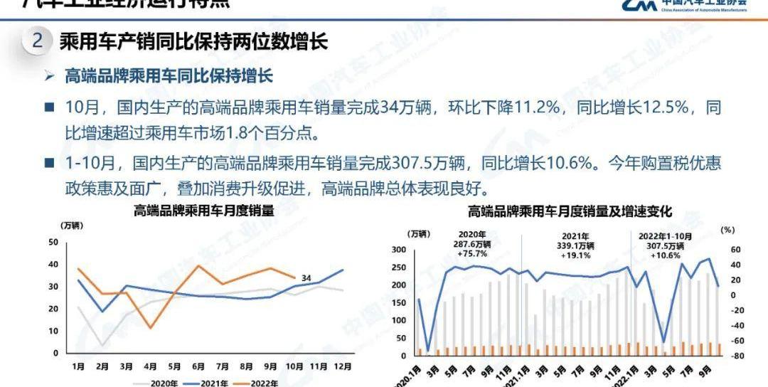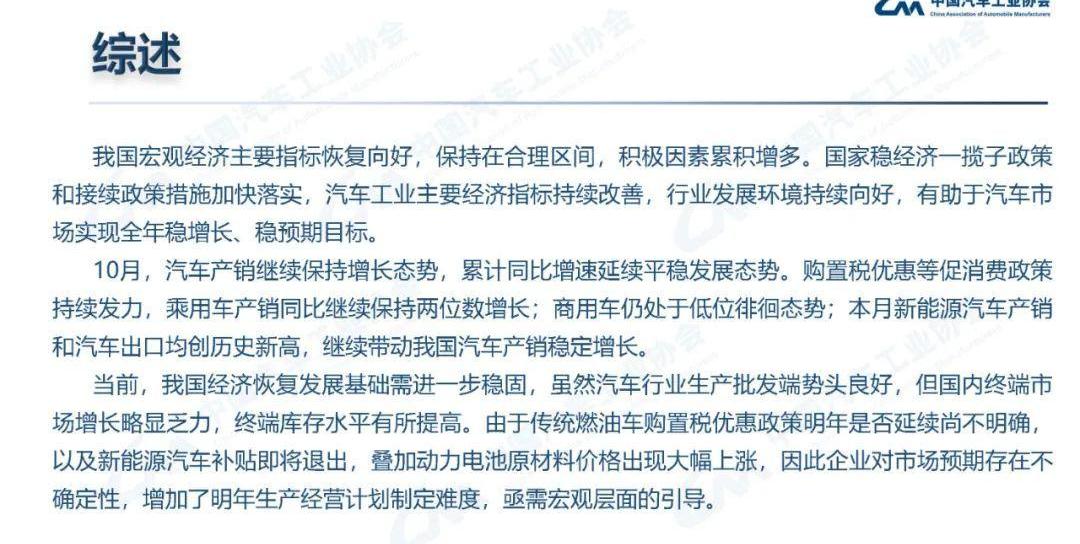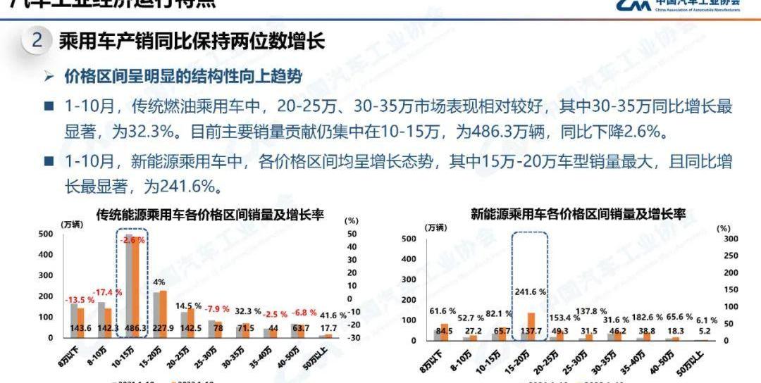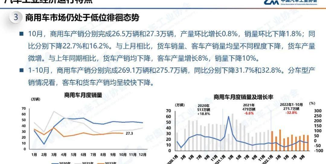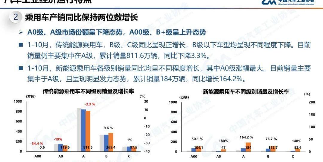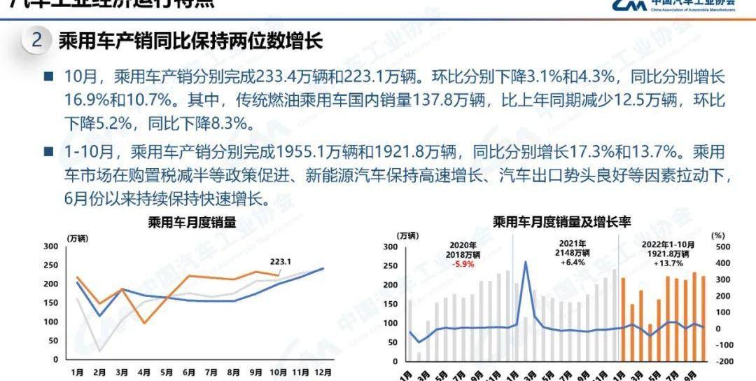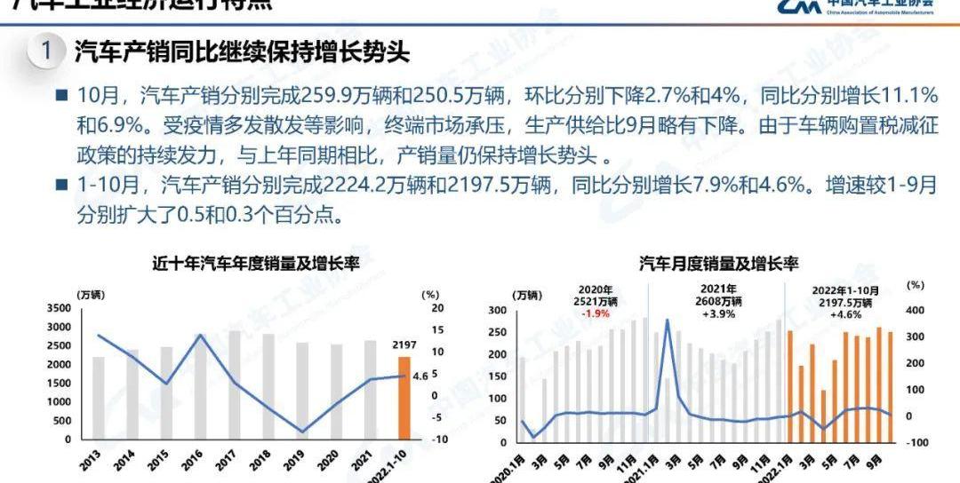 据中国汽车协会11月10日消息,10月,汽车产销分别完成259.9万辆和250.5万辆,环比下降2.7%和4%,同比分别增长11.1%和6.9%。1-10月,汽车产销分别达到2224.2万辆和2197.5万辆,同比增长7.9%和4.6%。