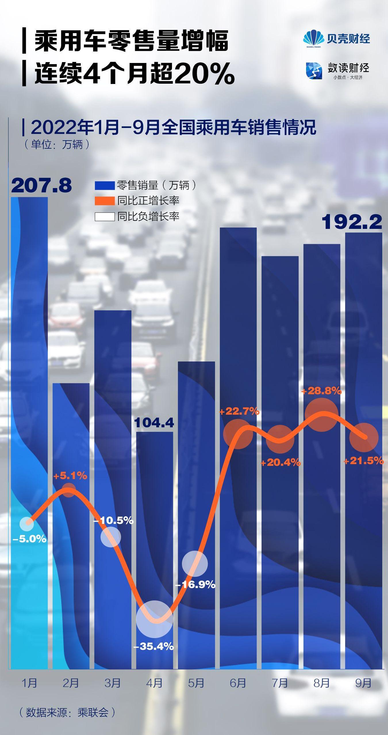 10月11日,乘用车市场信息联席会议发布了9月份全国乘用车市场分析。数据显示,前9个月,中国乘用车零售总额达到1487.5万辆,6月至9月大幅增长,连续4个月同比增速超过20%。9月份乘用车零售总额达到192.2万辆,与去年同期相比增长21.5%。今年以来,各地购车税优惠政策持续加大,汽车消费持续上升。9月份,乘用车零售额达到192.2万辆,同比增长21.5%。