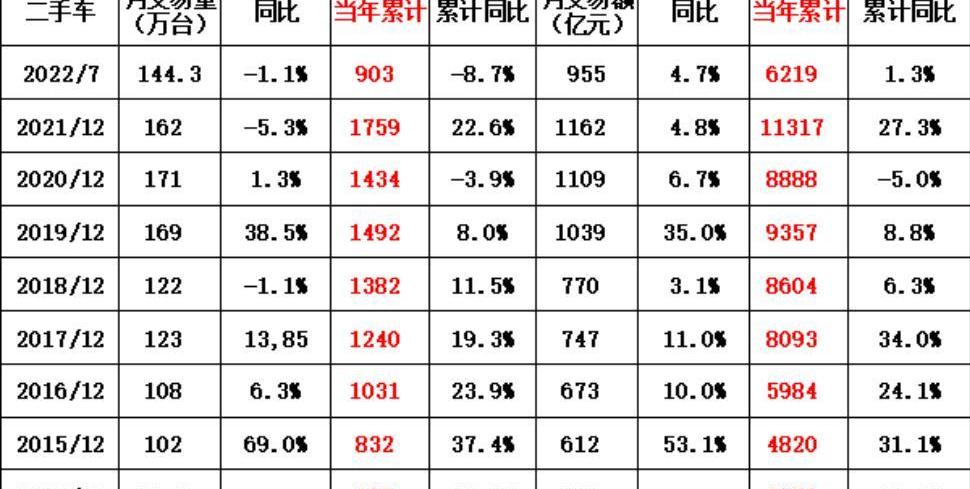 10月8日,据中新社报道,二手车市场或将进入强劲增长期。近年来,国内二手车市场发展迅速,从2014年的600万辆发展到2021的1759万辆,过去七年累计增长1100万辆,实现了规模化发展。2021,中国二手车交易额达到11317亿元。在这一点上,中国的二手车市场已经成为一个真正的万亿美元市场。该行业已进入发展快车道。截至2022年6月,中国汽车保有量已超过3.1亿辆,持有汽车驾驶证的人数已达4.5亿,其中1.4亿人持有驾驶证但没有汽车。中国的二手车面临着巨大的潜在市场。然而,与发展较早的发达国家相比,中国二手车市场起步较晚,交易比例较低,目前正处于快速上升阶段。2022年1-7月,受疫情干扰,国内二手车市场成交额同比下降8.7%,导致行业短期内整体表现疲软。与此同时,由于二手车交易水平的不断提高,二手车的交易量也在逐渐增加。2021,国内二手车交易额11317亿元,2022年1-7月达到6200亿元,同比增长1.3%。