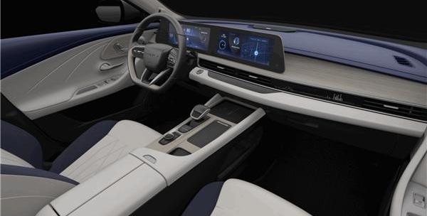 车辆内部设计有双屏幕和平行的空调通风口。控制区域集成在中控屏下方,A柱配有摄像头,整体外观给人一种非常简洁科技的感觉。
