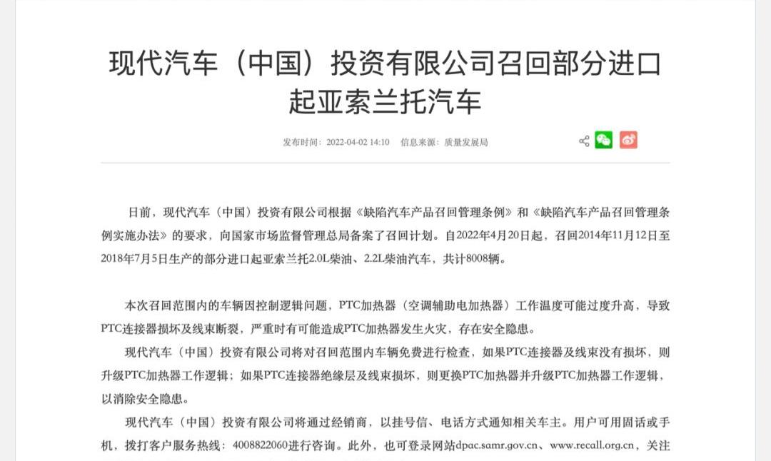 自2022年4月20日起,将召回2014年11月12日至2018年7月5日期间生产的8008辆起亚索兰托2.0升柴油和2.2升柴油进口车。由于控制逻辑问题,本次召回范围内的车辆上的PTC加热器的工作温度可能会过度升高,导致PTC连接器损坏和线束断裂。在严重情况下,可能会导致PTC加热器发生火灾,从而造成安全隐患。现代汽车投资有限公司将对召回范围内的车辆进行免费检查。如果PTC连接器和线束没有损坏,则PTC加热器的工作逻辑将升级;如果PTC连接器的绝缘层和线束损坏,请更换PTC加热器并升级PTC加热器的工作逻辑,以消除安全隐患---End---本文首发于微信公众号:产品可靠性报告。文章内容属于作者个人观点,不代表和讯网络的立场。投资者应据此操作,并承担风险。