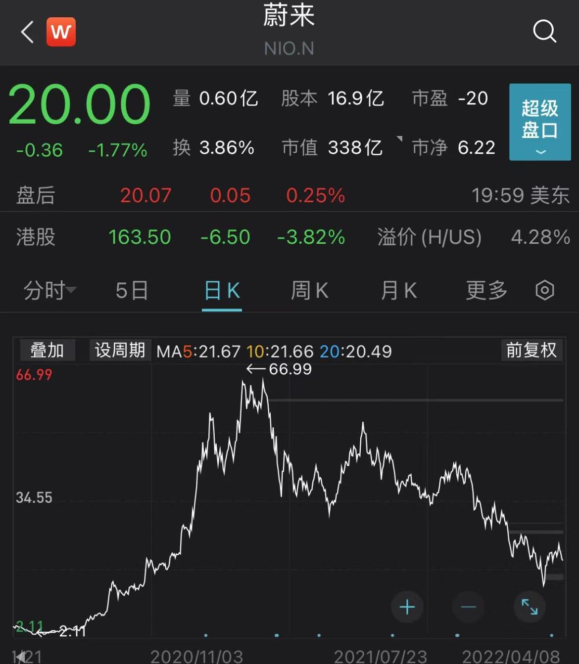 资料来源:截至美国东部时间4月8日收盘,中国概念股NIO Motors收于每股20美元。(中新经纬APP)
