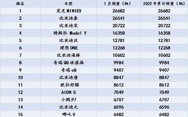 从品牌角度来看,新能源汽车市场仍保持着“百家争鸣”的局面。1月份,共有12家车企的新能源汽车月销量超过1万辆,与同期相比增加了6辆。其中,比亚迪以9.31万辆的成绩再次夺冠;特斯拉中国以5.98万辆的批发销量稳定了亚军地位;排名第三的上汽通用五菱销量为4万辆;奇瑞汽车、吉利汽车、广汽埃安、上汽乘用车、长城汽车(601633)、小鹏汽车、理想汽车和内扎汽车分列第四至第十一位。