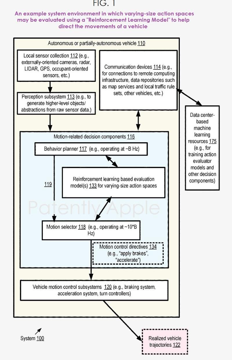 苹果泰坦项目的概念图是,机动车辆可以在没有或只有少量连续输入的情况下感知环境并导航,因此被称为自动驾驶或无人驾驶车辆,目前是研发的重点。最近,由于可用硬件和软件的限制,执行与分析车辆外部环境相关的计算所需的最大速度不足以在没有手动指导的情况下做出重要的导航决策。然而,即使使用了快速处理器、大内存和先进算法,自动驾驶汽车客观上也很难在不可预测的行为环境中做出及时合理的决策。此外,与车辆环境相关的静态和动态部件数据不够完整,存在大量干扰信息。通过使用基于神经网络的强化学习模型,各种方法和设备示例可以评估不同尺寸的自动驾驶汽车的动作空间。根据一些示例,一种方法可以包括确定自动驾驶或部分自动驾驶车辆在不同行驶时间点的当前状态。关于当前状态,该方法还可以包括可行的识别操作。例如,在一个示例中,使用车辆传感器捕获的数据可以在车辆的行为规划器的决策组件处被本地处理,并与地图信息相结合,以确定当前状态和可行的行动。在美国的一些州,当车辆在相对开阔、笔直的高速公路上行驶,几公里或几英里内没有转弯时,需要评估的行动数量可能相对较少;但在其他州,当车辆接近拥挤的十字路口时,行动次数可能会更高。在各种情况下,每个动作可以包括多个不同的组成属性或特征,例如起始/源车道段、目标车道段、在目标车道段中的目标速度、相对于一个或多个其他车辆或物体的定位等。车辆的决策组件可以负责评估给定状态下的不同可行动作,选择其中一个进行实施,将所选动作的抽象表示转换为详细的运动计划,并向车辆的低级别运动控制子系统发出指令,以实现与所选动作相对应的轨迹。在一些罕见的情况下,可以将多个实例或强化学习模型应用于车辆,以获得动作的相应值度量,该度量可以用于选择要实施的动作。在其他少数例子中,基于深度神经网络的机器学习模型可以用于强化学习模型。苹果公司的专利图1是一个示例系统环境图,其中可以使用强化学习模型来评估不同大小的动作空间,以帮助引导车辆运动。在各种情况下,乘客可能会忽略车辆的决策组件并做出决策,甚至暂时禁用车辆的决策部件;此外,在至少一种情况下,车辆的决策组件可以请求或要求乘客在特定条件下做出决策。