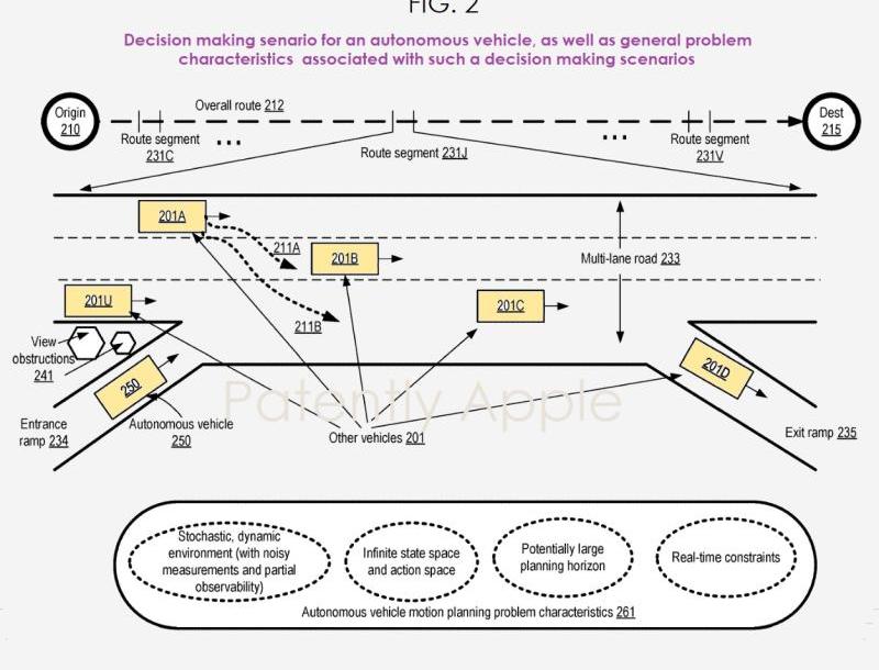 苹果专利图1和苹果专利图2是自动驾驶汽车决策场景的例子,并显示了此类决策场景的相关问题特征。系统必须了解驾驶员当前的路线以及并线的方式和时间;何时离开匝道或变道;了解各种车速,确保安全并线;检测道路状况;