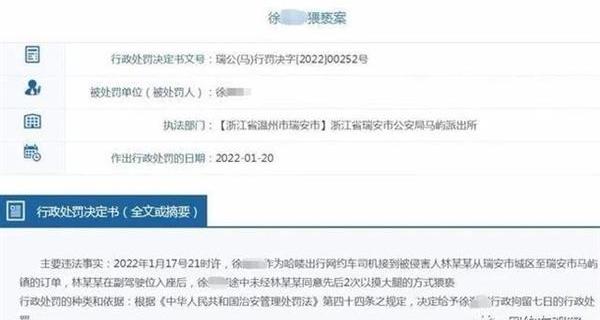 据浙江政务公开网报道,一名网约车司机接到受害人林某的订单,林某坐上副驾驶座后,该司机未经允许,用触碰乘客大腿的方式对其进行了两次性侵。随后,哈罗出行回应澎湃新闻称,司机曾两次触摸乘客大腿猥亵乘客:车主已永久禁止,并配合调查。此前有报道称,这名司机因两次未经允许触碰大腿并猥亵乘客,被行政拘留7天。