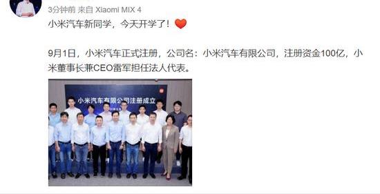 雷军在微博上发帖称,9月1日,小米汽车正式注册为小米汽车股份有限公司,注册资本100亿元。小米董事长兼首席执行官雷军担任法定代表人。