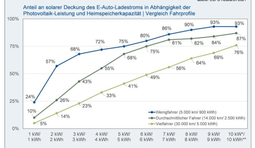 根据该协会的最新报告,对于年续航里程为14000公里的电动汽车来说,7kW的光伏系统与7kWh的家用电池相结合,可以提供其80%的电力需求。市场研究公司表示,这相当于每年2500千瓦时的总用电量。此外,对于一辆每年行驶5000公里、需要900千瓦时电力的电动汽车来说,通过6kW的光伏阵列和6kWh的电池可以实现同样的百分比。根据计算,对于电力需求经常达到5000千瓦时的司机来说,需要一个储能容量为12千瓦的系统。即使没有储能,电动汽车驾驶员也可以大量使用太阳能。例如,如果系统功率为7kW,但没有电池,太阳能发电可以在一年内满足车辆39%的电力需求。EUPD认为,太阳能+储能解决方案可以大大降低充电成本。将10kW系统与储能相结合,可以节省高达52%的充电成本,相当于每年节省415欧元。EUPD Research总经理Martin Ammon表示:“家庭储能系统对于临时储存用于电动汽车的自发太阳能至关重要,尤其是在冬季