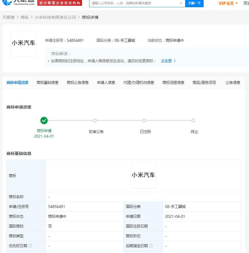 凤凰科技4月6日讯:据天眼茶App报道,近日,小米科技有限公司有限公司申请注册“小米汽车”商标,该商标在国际上被归类为手工工具,注册号为54856491。目前的商标状态正在进行商标申请。