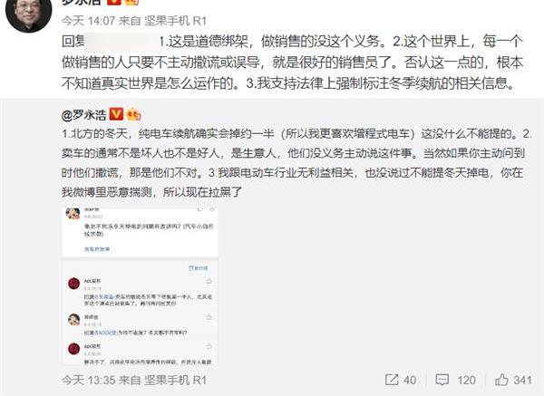 一些网民对此提出质疑,称至少在北方,电动汽车销售商有这一义务。因为在买卖过程中,买家几乎总是询问电池寿命,而卖家如果只谈论夏季电池寿命,就相当于故意隐瞒。在微博留言区,罗永浩愤怒地激怒了网友:1。这是一种道德绑架,销售人员没有这种义务。在这个世界上,每个销售人员都是一个伟大的销售人员,只要他们不主动撒谎或误导。那些否认这一点的人根本不知道现实世界是如何运作的。3.我支持在法律上强制标注冬季靶场相关信息。事实上,在销售电动汽车时,当前的销售通常使用具有最佳数据的NEDC系列来告诉消费者汽车的续航里程。然而,在实际驾驶中,用户通常无法达到这样的范围。这样一来,车主心中难免会有落差,甚至会觉得厂家做了虚假宣传。因此,你认为消费者在购买新能源汽车时有必要告知他们的真实冬季续航里程吗?