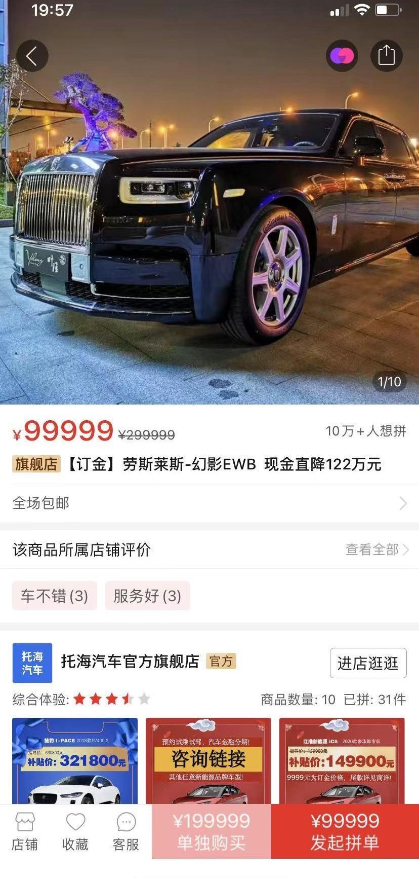 但最近,拼多多平台上的一家店铺出售了劳斯莱斯幻影,并提供了122万元的补贴。