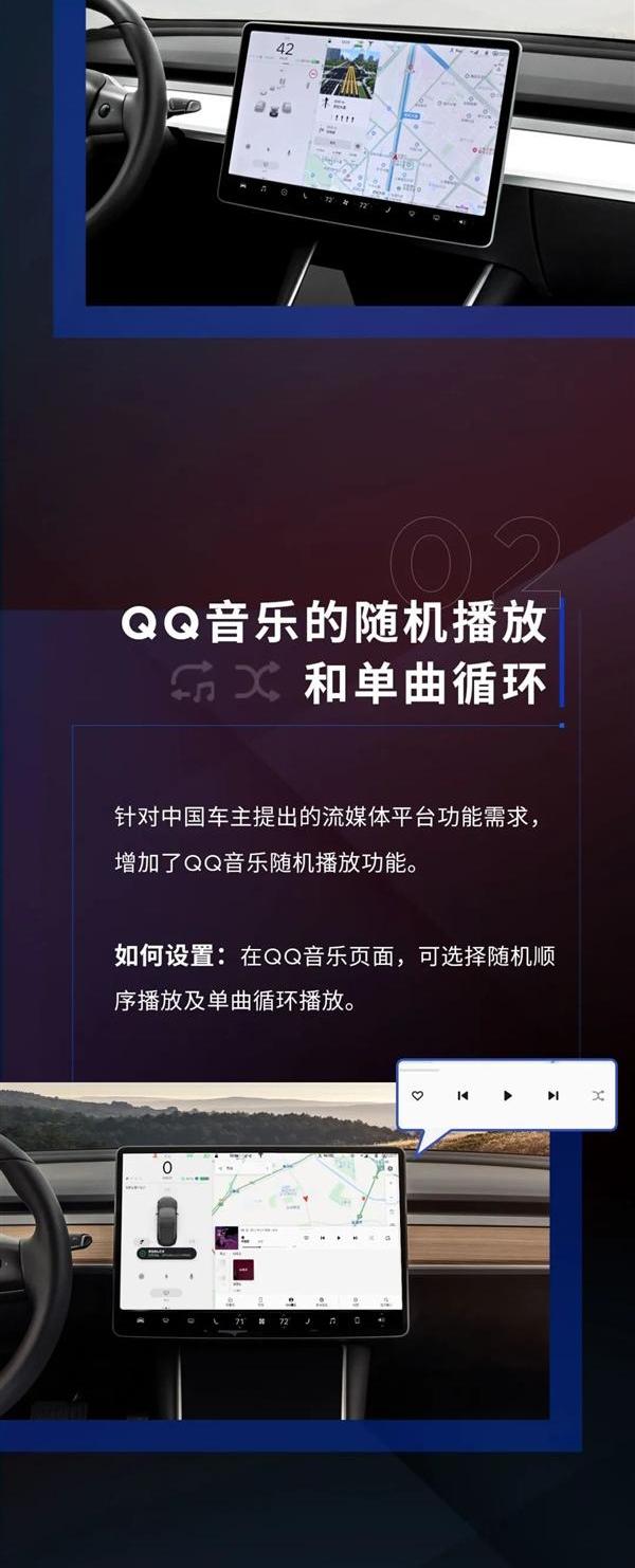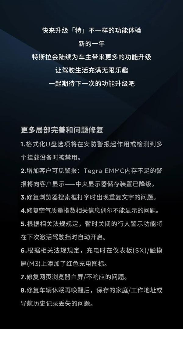2020年底,特斯拉推送了系统更新,声称是专门为中国车主设计的,包括增加了用于路口放大的车内导航功能、动态刹车灯功能和QQ音乐随机播放功能。据了解,为了更好地适应中国的高速十字路口和城市十字路口,新软件可以在仪表盘和触摸屏上显示十字路口的放大图像,并有箭头来引导车道的方向。针对中国车主提出的流媒体平台功能要求,增加了QQ音乐随机播放功能。新版本还支持语音消息广播,车辆将自动播放发件人的电话号码和信息内容。它还可以识别驾驶员的语音,并将其转换为短信回复文本。在驾驶过程中发送和接收短信更加方便。在动态制动灯方面,当车辆行驶速度超过50公里/小时时,如果驾驶员实施紧急制动,制动灯将迅速闪烁,危险警告灯将亮起,以提醒其他道路使用者您的车辆正在紧急减速。当车辆通过紧急制动完全停止时,危险警告灯将继续闪烁。您需要手动按下危险警告灯的关闭按钮或再次踩下加速踏板以关闭危险警告灯。Sentinel模式得到了改进,当触发报警状态时,它会将大约一分钟的行车记录仪视频文件存储在内部存储空间中,可以通过行车记录仪查看器查看。文件将保存一个月,或在容量达到200M时删除。让我们看看下面的官方图片:
