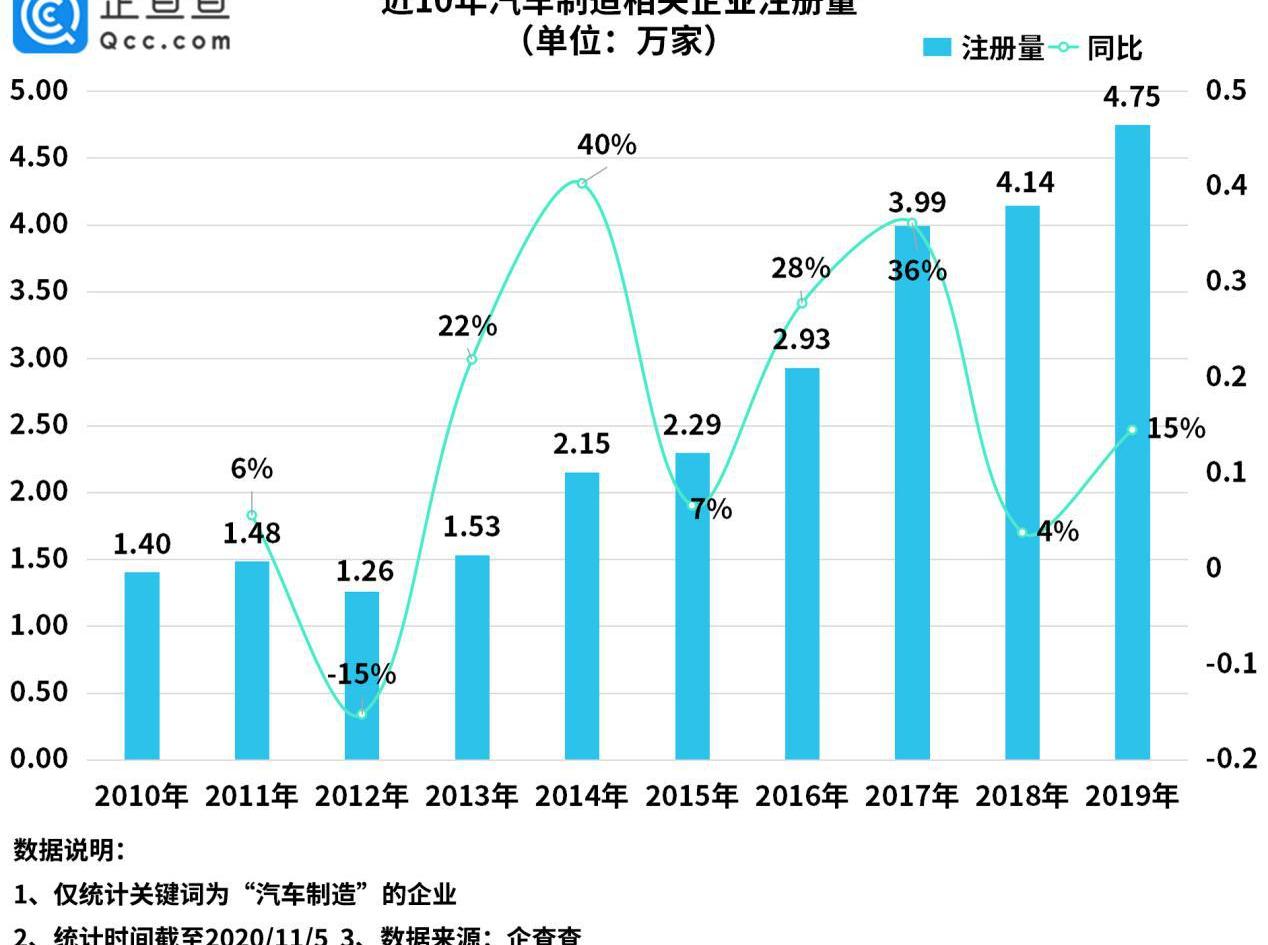 企查查数据显示,近10年来,我国汽车制造相关企业注册量呈波动增长趋势。2014年的增长率是近10年来最高的,同比增长40%,注册量为2.15万。2019年注册量创近10年来新高,累计新增注册4.75万件,同比增长15%。