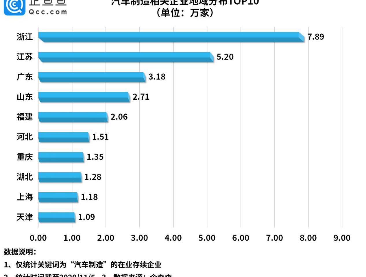 从地域上看,根据企查查数据,中国汽车制造相关企业主要集中在浙江、江苏和广东,分别以7.9万家、5.2万家和3.2万家位居前三。