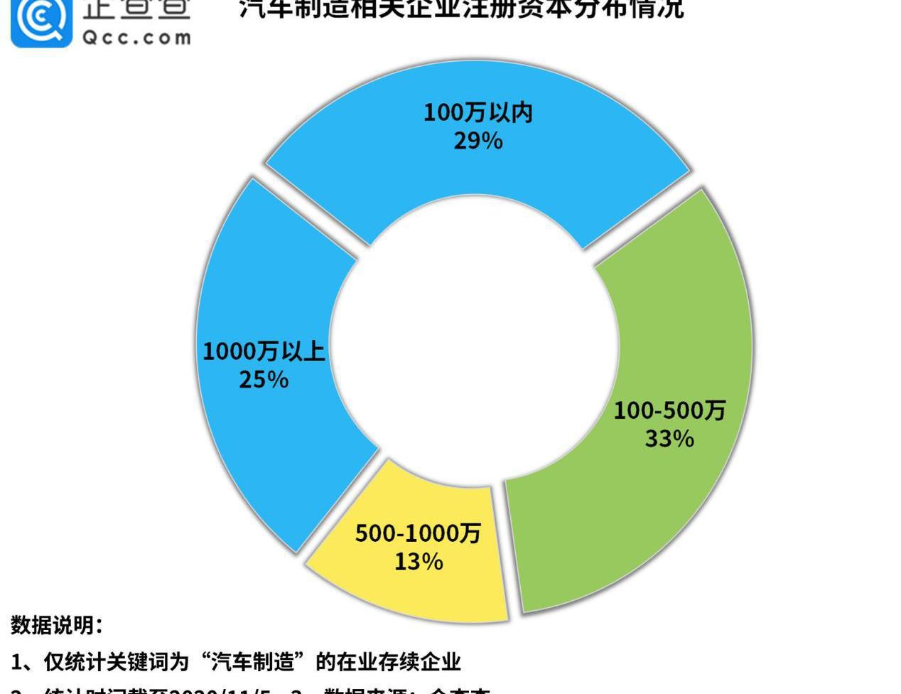 从注册资本来看,企查查数据显示,中国60%以上的汽车制造相关企业注册资本在500万以下,其中29%的企业注册资本低于100万,33%的企业注册资金在100万至500万之间,注册资本在1000万以上的占总数的25%。编辑徐超校对王欣