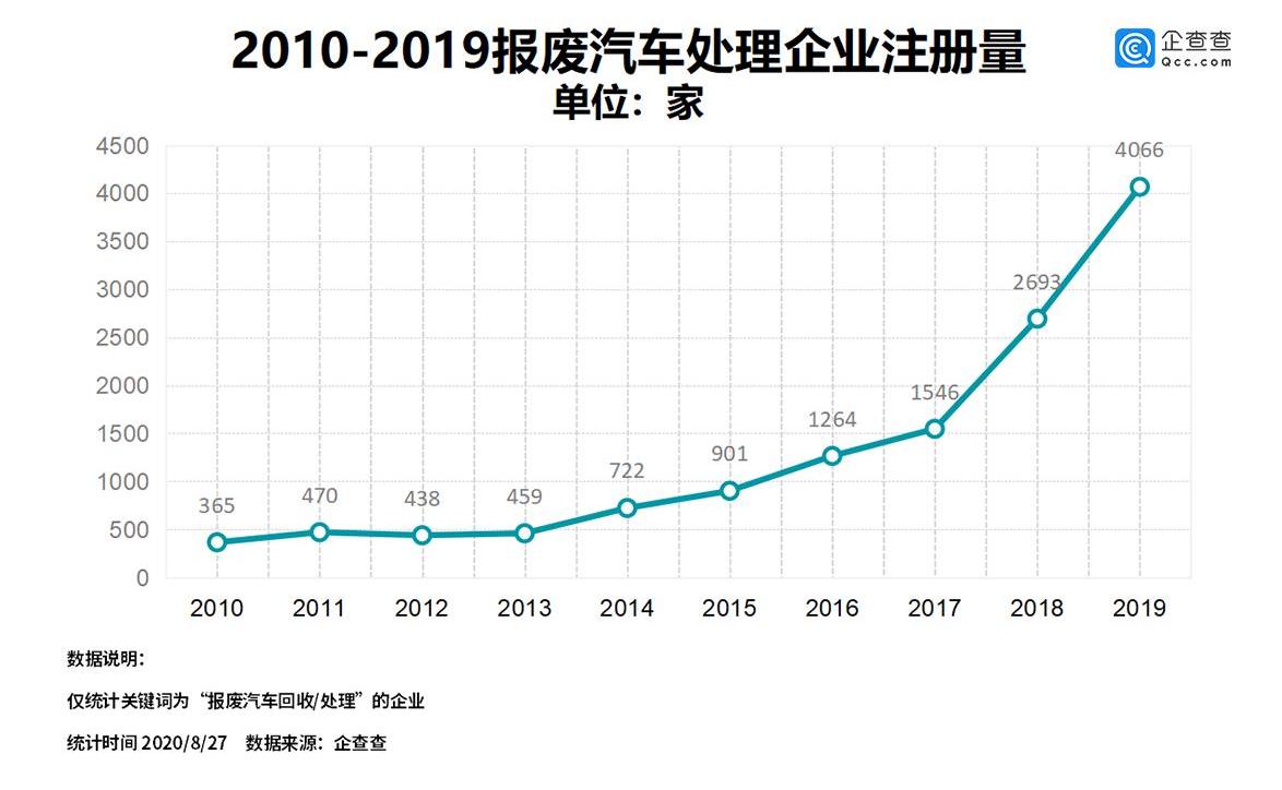 近日,商务部等七部门联合发布《报废机动车回收管理办法实施细则》,将于9月1日起施行,加快了我国报废机动车回收拆解行业市场化发展进程,并使车主处理报废车辆更加方便。根据企业检查数据,目前中国有1.6万家相关企业处理或回收汽车报废。在过去的十年里,相关企业的年度注册量一直在逐年增加。2019年,新注册4066家,同比增长51%,与十年前的数据相比增长了10.1倍。今年上半年,相关企业新增1872家,同比下降4.5%。从地区分布来看,广东省以1858家企业位居第一,山东、福建则居二三位。过去十年,每年的注册量增长了10.1倍,在广东、山东和福建排名前三。近年来,随着汽车行业的稳步发展,汽车报废处理行业的规模不断扩大。根据企业检查数据,截至2020年8月底,中国共有16044家在建和存续的与汽车报废处理或回收有关的企业。过去十年,相关企业的年度注册量持续上升,2019年新增企业4066家,同比增长51%。然而,十年前——2010年,中国与汽车报废相关的注册企业数量仅为365家,企业的年度注册量在过去十年中增长了10.1倍。从区域分布来看,企查查数据显示,广东省以1858家企业位居全国第一,山东省和福建省分别以1514家和820家企业位居第二和第三。其次是湖南省、安徽省和四川省。