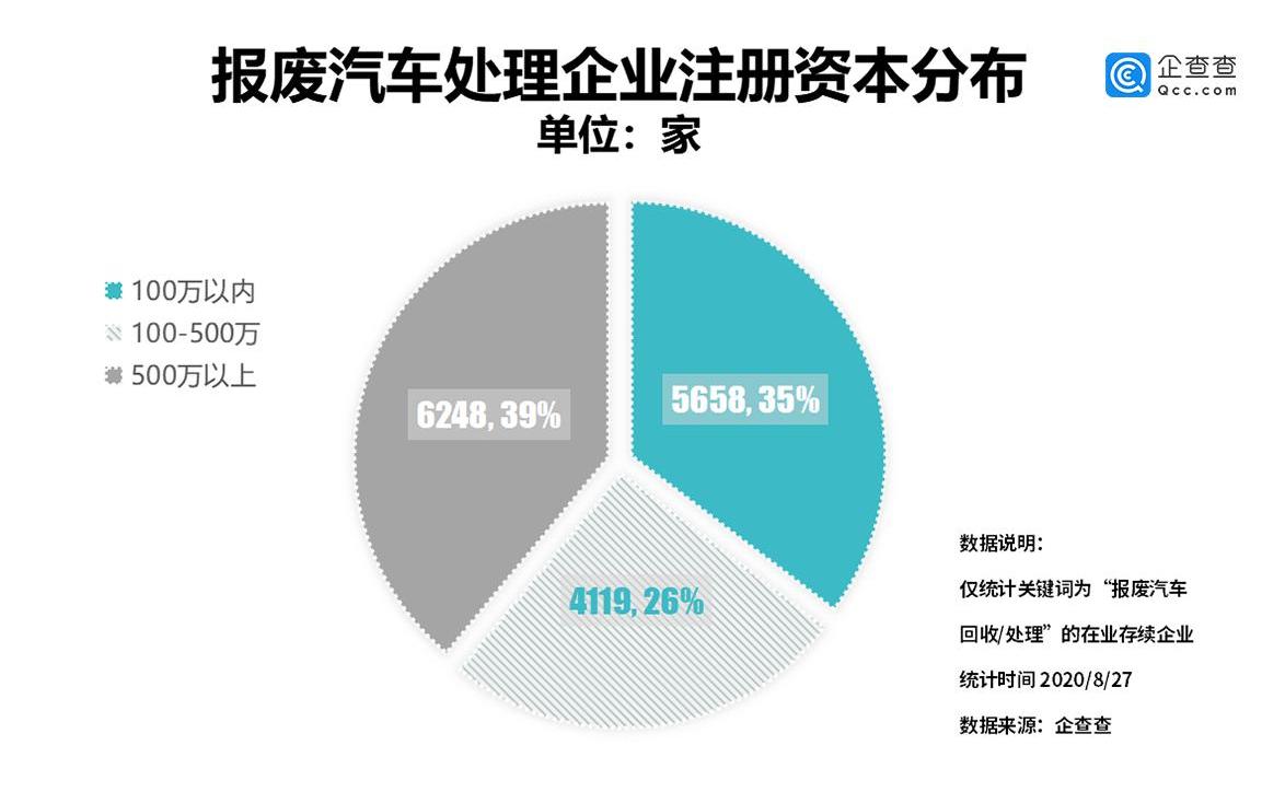 从企业注册资本分布来看,根据企查查数据,中国注册资本超过500万的企业有6248家,占比39%。500万到1000万之间的企业数量最少,占比26%。注册资本在100万以下的企业占35%。报废汽车对环境造成许多危害,对土壤、水体和大气造成严重污染。因此,加快淘汰“黄标车”,规范报废车辆回收拆解,是控制环境污染的重要途径,也是我国实现循环经济可持续发展的重要举措之一。报废汽车加工业的发展不仅节约能源、减少矿产资源、保护生态环境,而且对我国汽车工业的发展、劳动力就业、环境保护、减少道路安全隐患都有积极的促进作用。校对:李世辉